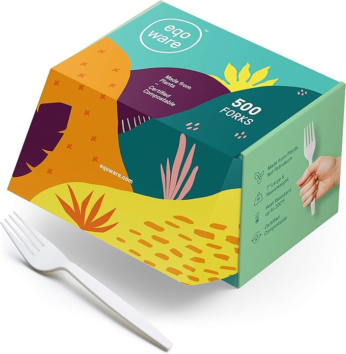 eqoware Certified Compostable Forks Made from Plants | 500 Pack Bulk | 7" Large, Sturdy & Heat...